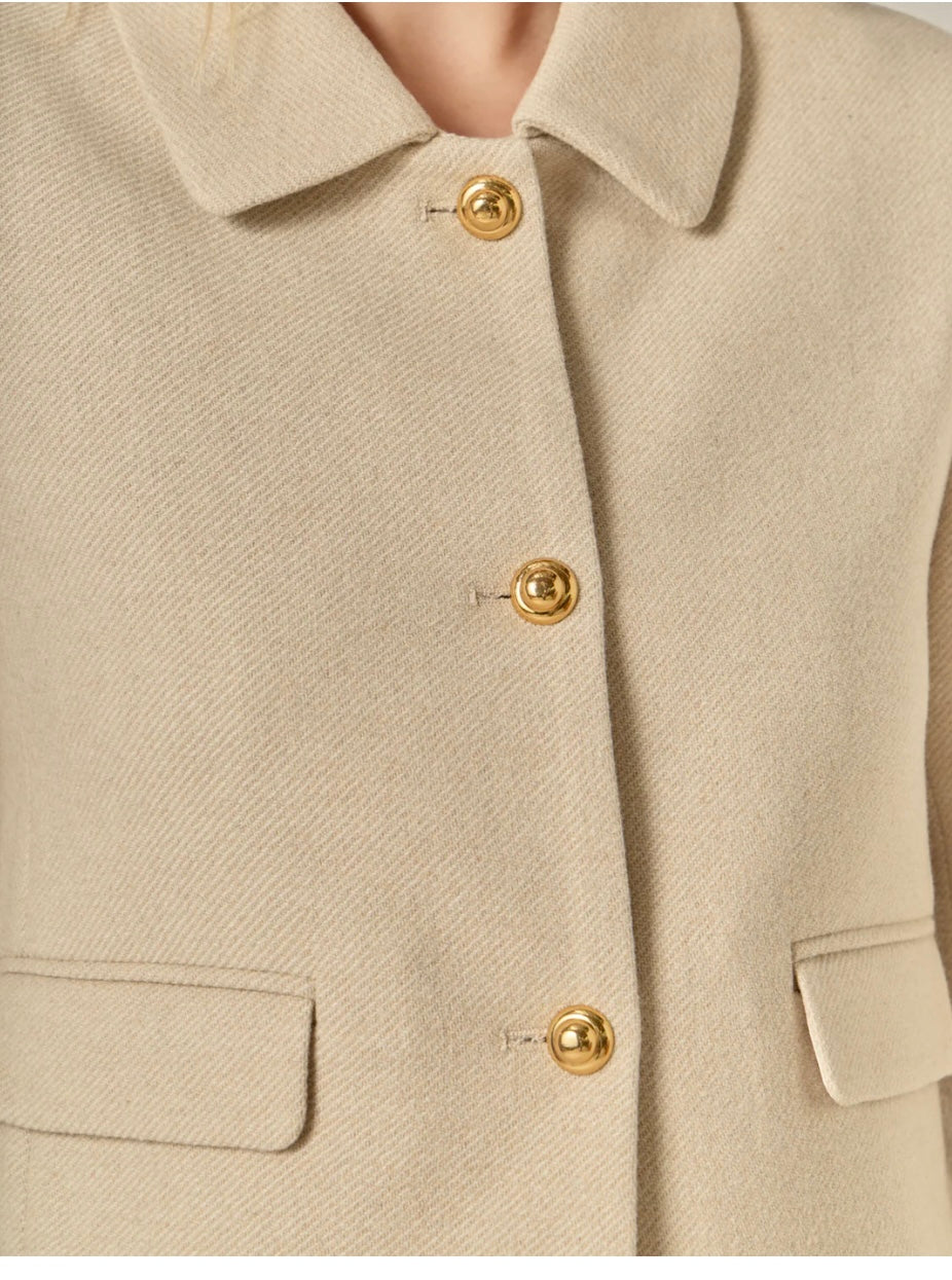 The Buttoned Cropped Jacket is a polished staple that balances modern tailoring with timeless charm. Crafted from a soft, structured fabric, it features a clean collared neckline, gold-tone button closure, and flap pockets that add a refined finish. The cropped length and contoured fit create a flattering, versatile silhouette that transitions seamlessly from day to evening. Perfect for pairing with matching shorts or high-waisted trousers, this jacket captures the essence of quiet luxury—sophisticated, minimal, and effortlessly.