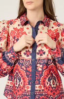 Effortlessly feminine and undeniably chic, this top is crafted from 100% printed cotton poplin. Designed with a flattering body-skimming silhouette, it features voluminous long sleeves that taper into structured, fitted cuffs for a touch of drama.