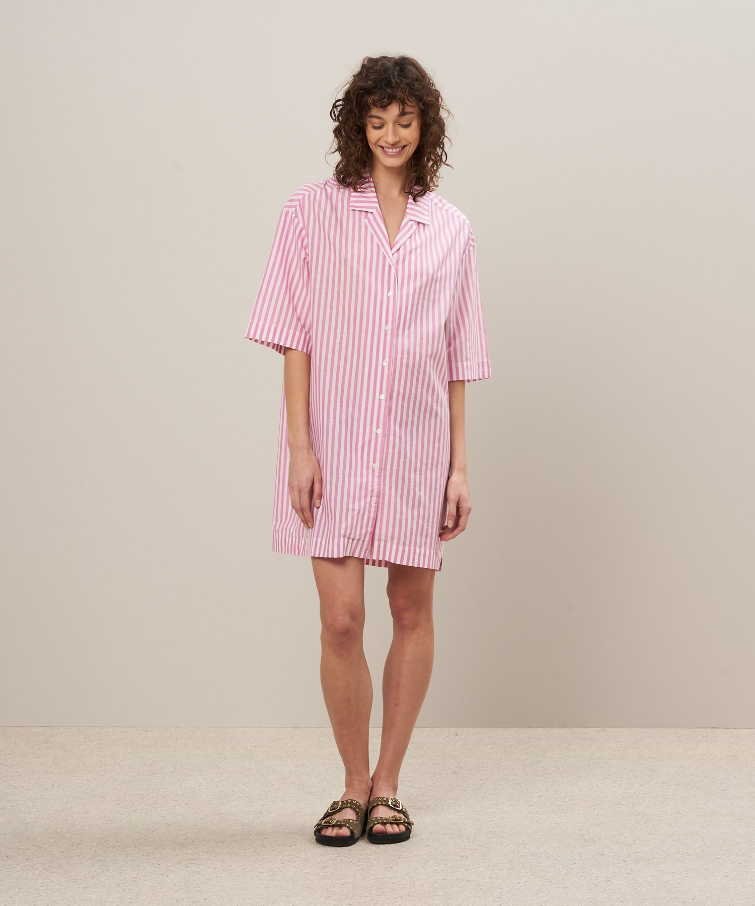 Women's shirt dress "Rafik" in striped cotton voile. Tailored collar, drop armholes, and short sleeves. Showcases an exposed button placket and two small side slits.