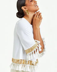 Handmade silk tassels and sequin applied to cuffs and hem