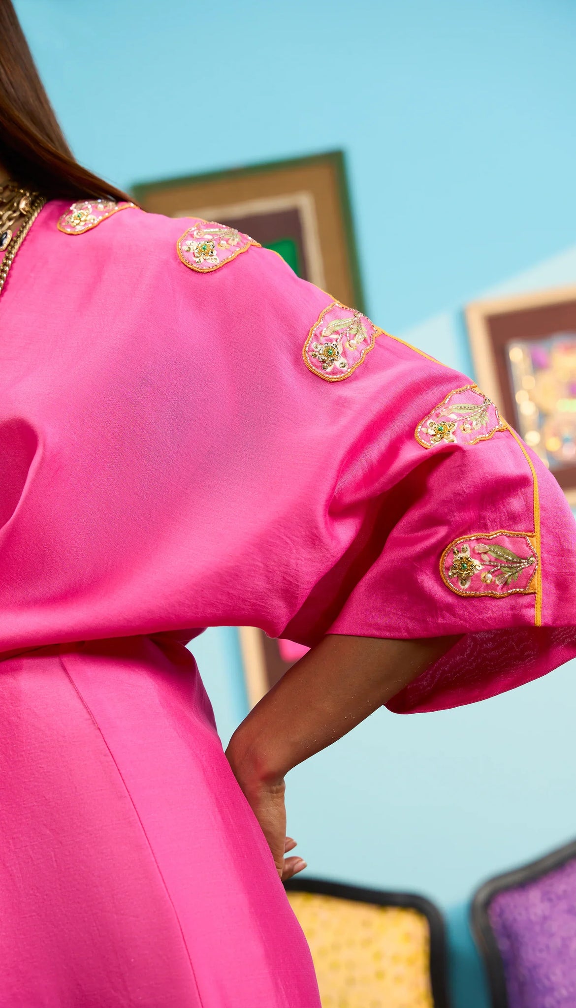A plain solid-color V-neck kaftan with detailed embroidery on the sleeves, paired with a soft shantoon slip.