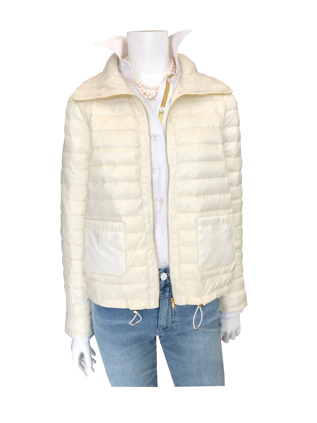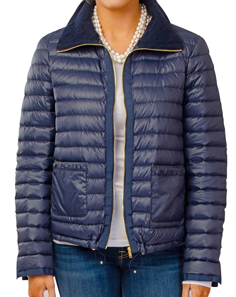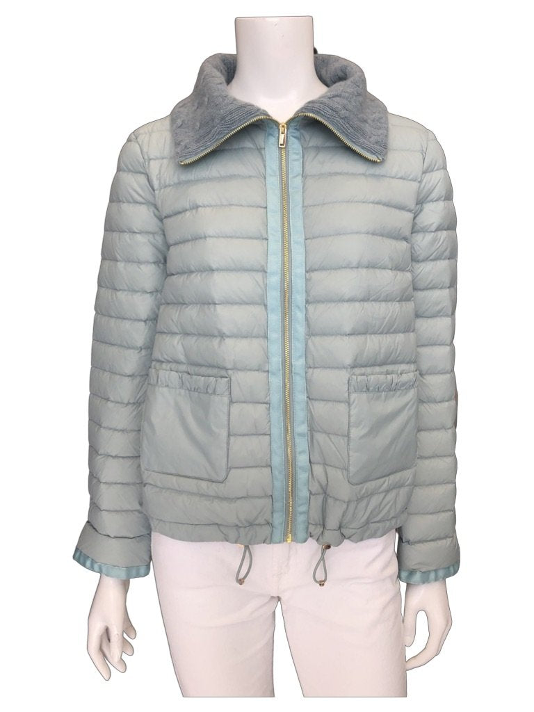 90% Down 10% Feather. Lining 100% Nylon. Cashmere cable neck.